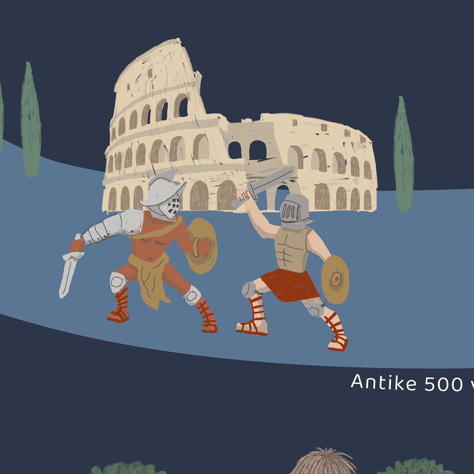 Epische Zeitreise: Faszinierende Illustrationen führen durch alle Epochen – von der Steinzeit bis zur Zukunft im All.