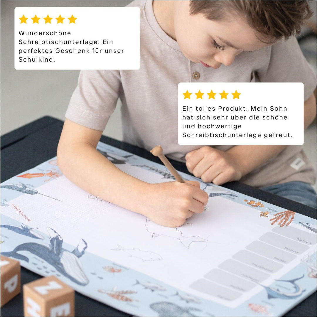 Diese tolle Schreibtischunterlage mit spannenden handgezeichneten Meerestieren, eignet sich nicht nur prima um die Woche zu organisieren, sonder auch um die Namen der beschrifteten Meeresbewohner zu erfahren. Die freie Fläche kann zum notieren was nicht vergessen werden darf oder malen eigener, großartiger Kunstwerke genützt werden. Perfekt für kleine Meeresforscher, Schulanfänger und Kindergartenkinder.